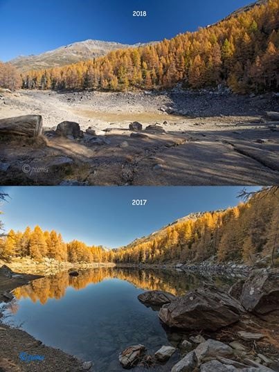 Итальянский фотограф Марко Пульезе путешествовал по Альпам с надеждой сделать фотографию знаменитого Голубого озера, однако, его ждало разочарование и шок. Озеро практически высохло, сильно измельчало и стало выглядеть вовсе не так как раньше. Марко тотчас же поделился находкой в соцсетях, выложив фото того, как водоем выглядел в прошлом году и в этом. Разница была колоссальной: на настоящий момент от озера осталась какая-то жалкая лужица в грязи.