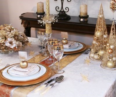 Скатерть подойдет коричневая, белая с золотыми узорами, золотистая, оранжевая или желтая. Салфетки лучше брать на контрасте, чтобы они не сливались со скатертью. Красиво будет смотреться белоснежная скатерть, с тонким золотистым узором, а так же золотые элементы декора на ней.