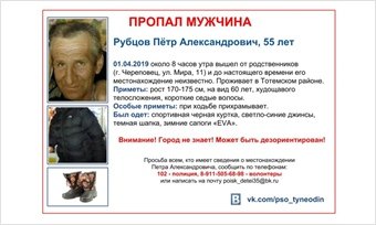 Вчера в Череповце вышел от родственников, проживающих на Мира, 11, и не вернулся 55-летний житель Тотемского района Пётр Алексеевич Рубцов. Город он не знает, может быть дезориентирован. С 8-ми утра вчерашнего дня о нём нет никаких сведений.