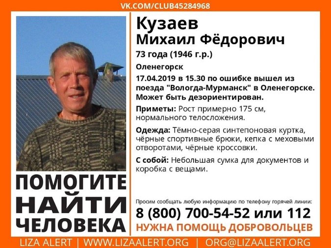 Пропал 73-летний житель дер. Малая Пушня Шекснинского района — Кузаев Михаил Федорович, который может страдать дезориентацией. Мужчина взял билет от Вологды до Мурманска, однако, по неизвестным причинам покинул поезд на станции Оленегорск. Родственники рассказали, что у него там не может быть знакомых или друзей.