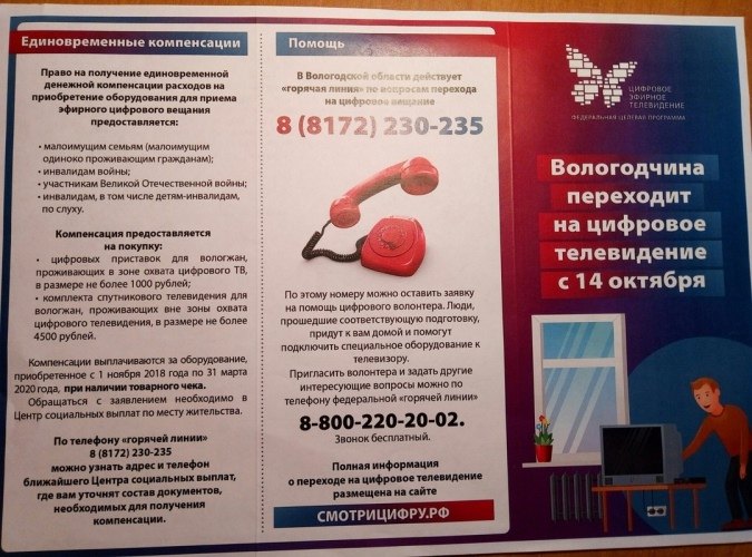 Кадуйчанам напоминают, что практически все телевизоры, купленные после 2012 года, поддерживают «цифру» — достаточно просто настроить нужные параметры. В остальных случаях стоит приобрести специальную приставку, купить новый телевизор и даже получить компенсацию от государства на покупку техники.