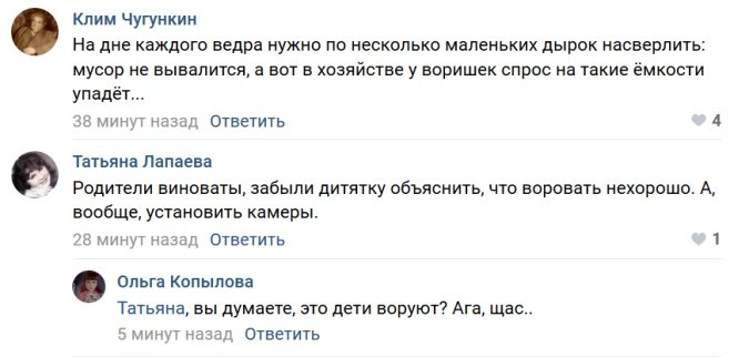 Некоторые жители даже предложили просверлить в ведрах дырки, чтобы снизить привлекательность ведер для потенциальных воров. Якобы для дела никаких последствий, а вот в хозяйстве с таким ведром могут возникнуть сложности.