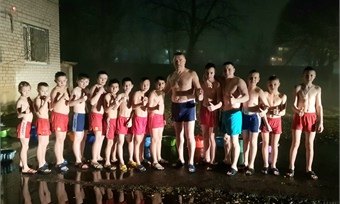Виктор Кузнецов также поддержал традицию и вместе с воспитанниками СК «Пионер» облился с утра пораньше холодной водой.