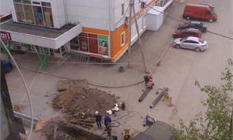 Возле дома № 13 на ул. Труда уже третий раз за год раскопали трубы. При этом, по заявлению анонима, работает в яме только один человек, в то время как двое других — лишь «машут руками».