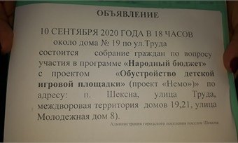Собрание жильцов и неравнодушных шекснинцев пройдет 10 сентября в 18.00. Приглашаются все соседи с активной гражданской позицией.