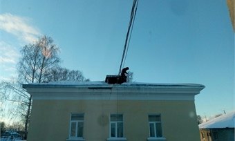 Помимо уборки снега с дорог и тротуаров кадуйские коммунальные службы начали чистить кровли домов от снега и сосулек
