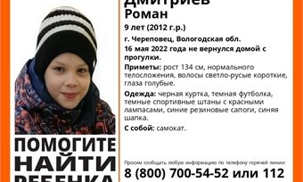 9-летний Роман Дмитриев вышел из дома в Череповце на прогулку 16 мая, и с тех пор о его местонахождении нет никакой информации.