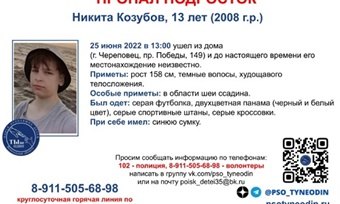 По данным Региональной общественной организации Поисково-спасательный отряд «Ты не один», 25 июня 13-летний Никита Козубов ушел из дома140 по проспекту Победы, и где он находится сейчас до сих пор неизвестно.