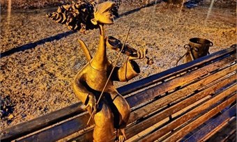 Необычная скульптура установлена на одной из скамеек центральной аллеи.
