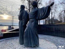 В социальных сетях стали появляться фотографии памятника Афанасию и Феодосию, на которых ноги отцов-основателей прочно сковал цемент.